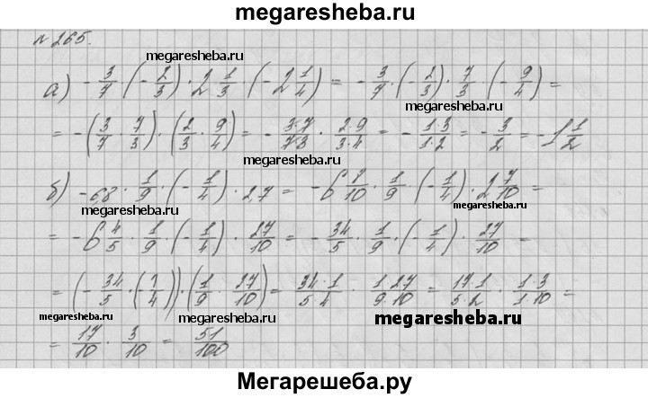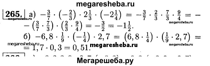 265. Выполните умножение, выбрав удобный порядок вычислений: а) -3/7 * (-2/3) * 2*1/3 * (-2*1/4); б) -6,8 * 1/9 * (-1/4) * 2,7.