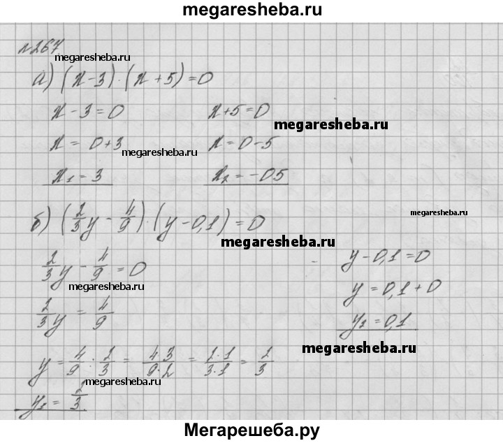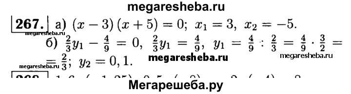 267. Решите уравнение: а) (х - 3) (х + 5) = 0; б) (2/3у - 4/9)(у - 0,1) = 0.