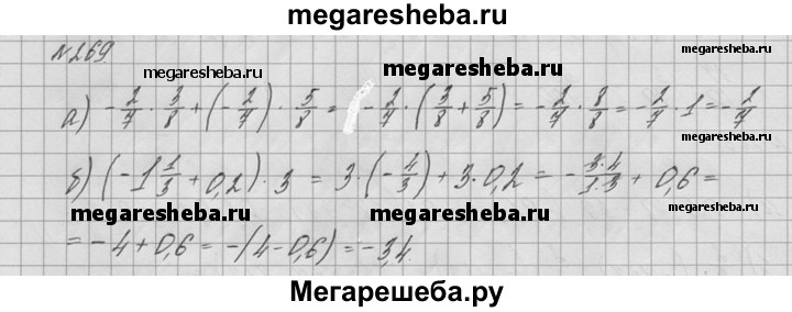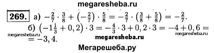 269. Найдите значение выражения, применив распределительное свойство умножения: а) -2/7 * 3/8 + (-2/7) * 5/8; б) (-1*1/3 + 0,2) * 3.