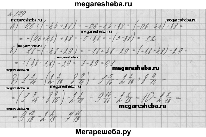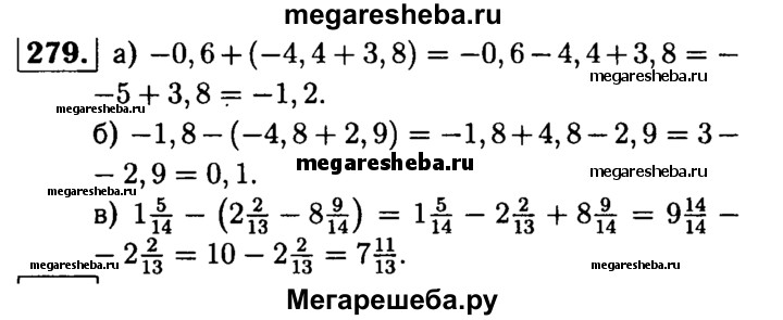 279. Раскройте скобки и найдите значение выражения: а) -0,6 + (-4,4 + 3,8); б) -1,8 - (-4,8 + 2,9); в) 1*5/14 – (2*2/13 – 8*9/14).