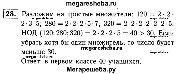 28. Для учащихся первого класса приготовили одинаковые подарки. Во всех подарках было 120 шоколадок, 280 конфет и 320 орехов. Сколько учащихся в первом классе, если известно, что их больше 30?