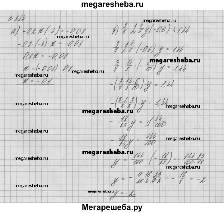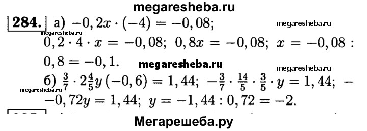 284. Решите уравнение: а) -0,2x (-4) = -0,08; б) 3/7 * 2*4/5у(-0,6) = 1,44.