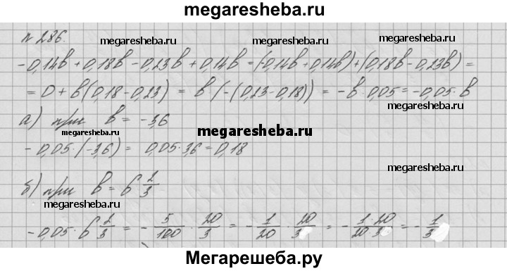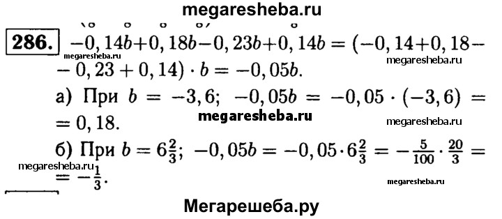 286. Упростите выражение -0,14b + 0,18b - 0,236 + 0,14b и найдите его значение, если: a) b = -3,6; б) b = 6*2/3 .