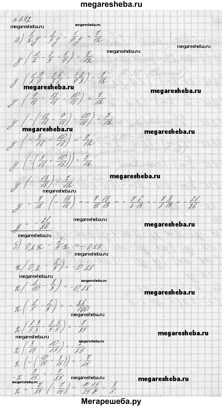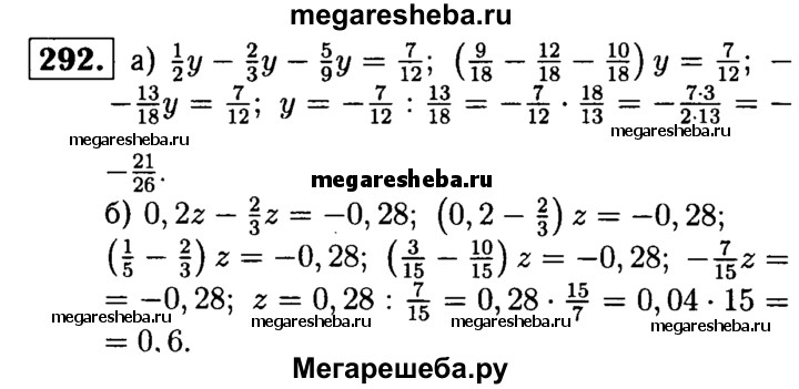 292. Решите уравнение: a) 1/2y – 2/3y – 5/9y = 7/12; б) 0,2z – 2/3z = - 0,28.