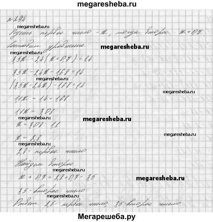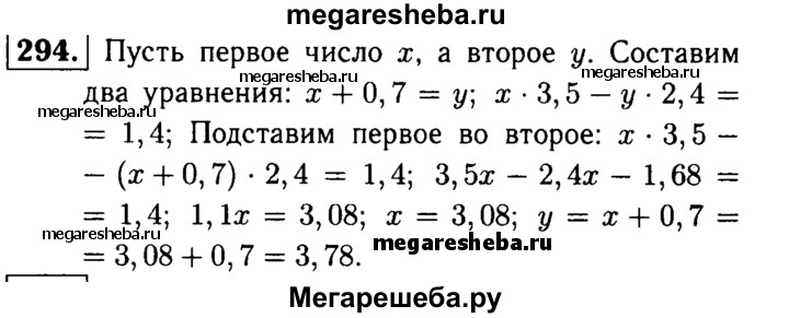 294. Первое число на 0,7 меньше второго. Если первое число умножить на 3,5, а второе — на 2,4, то разность этих произведений будет равна 1,4. Найдите эти числа.