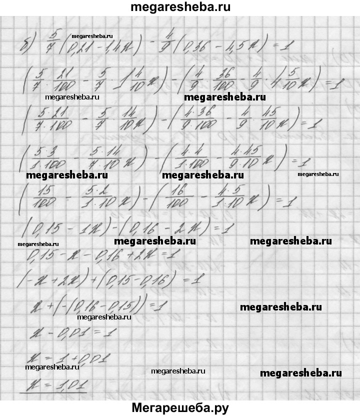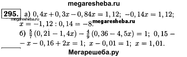 295. Решите уравнение: а) 0,4x + 0,3x -0,84x = 1,12; б) 5/7(0,21 - 1,4х)- 4/9(0,36 - 4,5х) = 1.