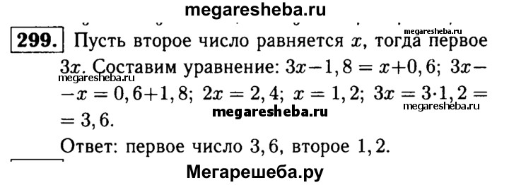 299. Первое число в 3 раза больше второго. Если от первого числа отнять 1,8, а ко второму прибавить 0,6, то получатся одинаковые результаты. Найдите эти числа.