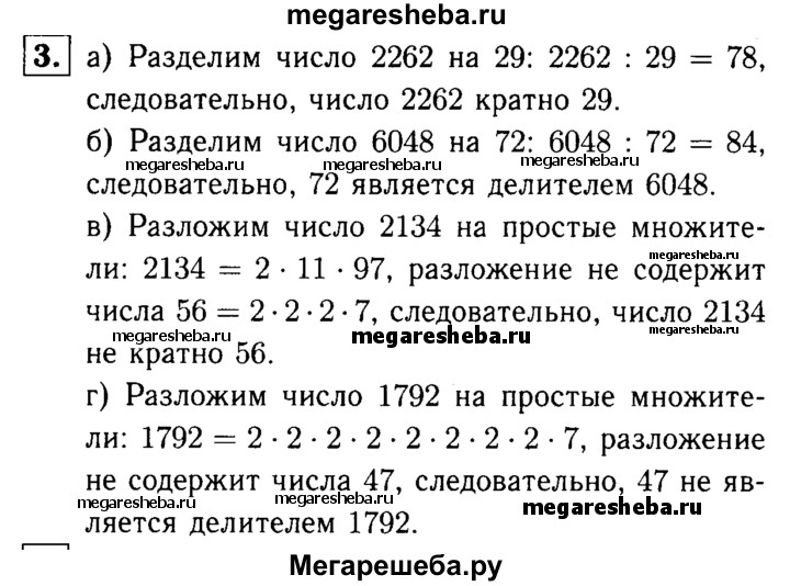 3. Докажите, что: а) 2262 кратно 29; б) 72 является делителем 6048; в) 2134 не кратно 56; г) 47 не является делителем 1792.