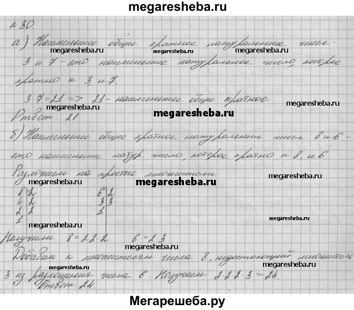 30. Найдите наименьшее общее кратное чисел: а) 3 и 7; б) 8 и 6; в) 9 и 14; г) 180 и 120.