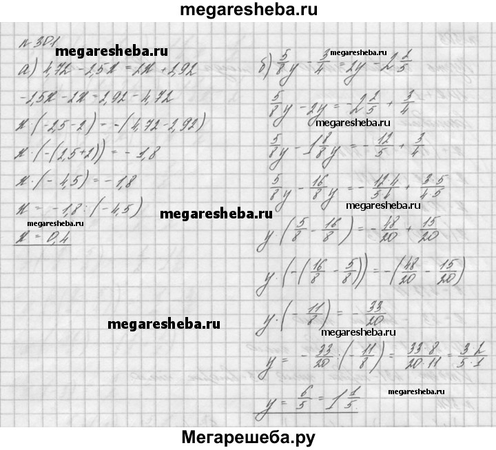 301. Решите уравнение: а) 4,72 - 2,5x = 2х + 2,92; б) 5/8у – 3/4 =2у-2*2/5.