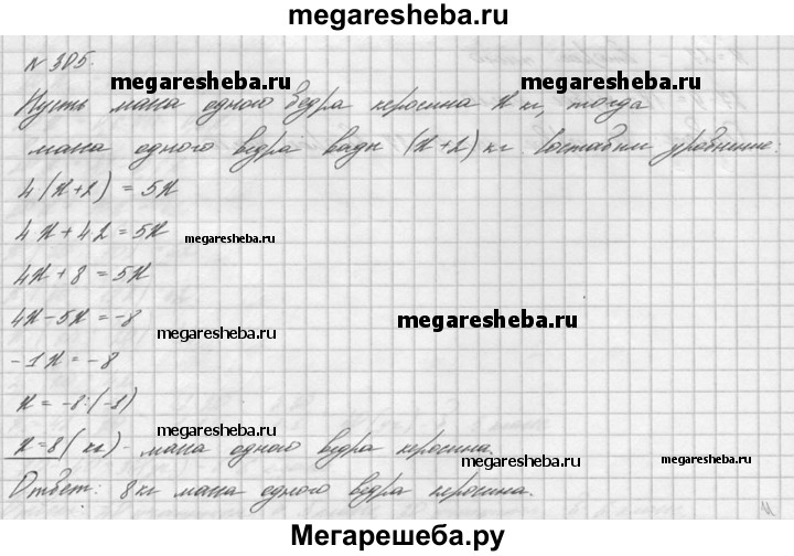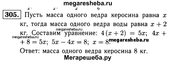 305. Ведро воды тяжелее такого же ведра керосина на 2 кг. Какова масса одного ведра керосина, если масса 4 ведер воды такая же, как и масса 5 ведер керосина?