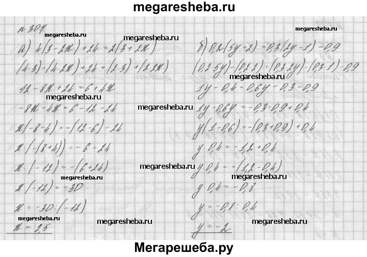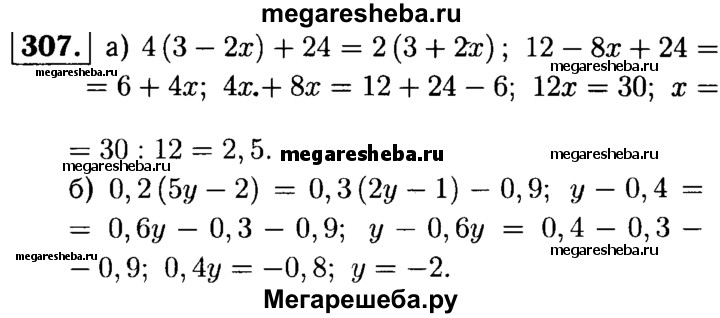 307. Решите уравнение: а) 4(3 - 2х) + 24 = 2(3 + 2х); б) 0,2(5у - 2) = 0,3(2у -1) - 0,9.
