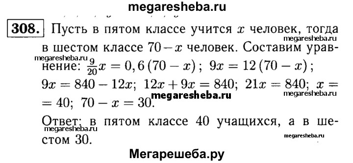 308. В пятом и шестом классах учится 70 человек. В пятом классе мальчики составляют 9/20 всех учащихся этого класса, а в шестом классе мальчики составляют 0,6 всех учащихся своего класса. Сколько учащихся учится в пятом классе и сколько учащихся учится в шестом классе, если мальчиков в этих классах поровну?