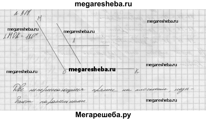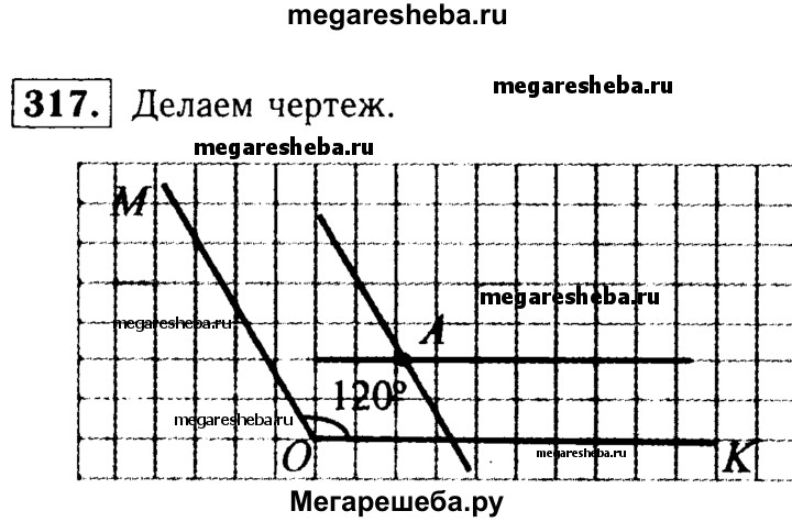 317. Постройте угол МОК, равный 120°, и внутри его отметьте точку А. Проведите через точку А прямые, параллельные сторонам угла.