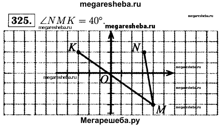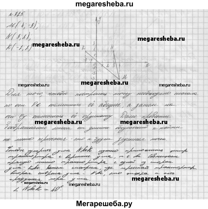 325. Отметьте на координатной плоскости точки М(4; -3), N(3; 2) и К(-2; 2). Проведите лучи MN и МК. Измерьте угол NMK.