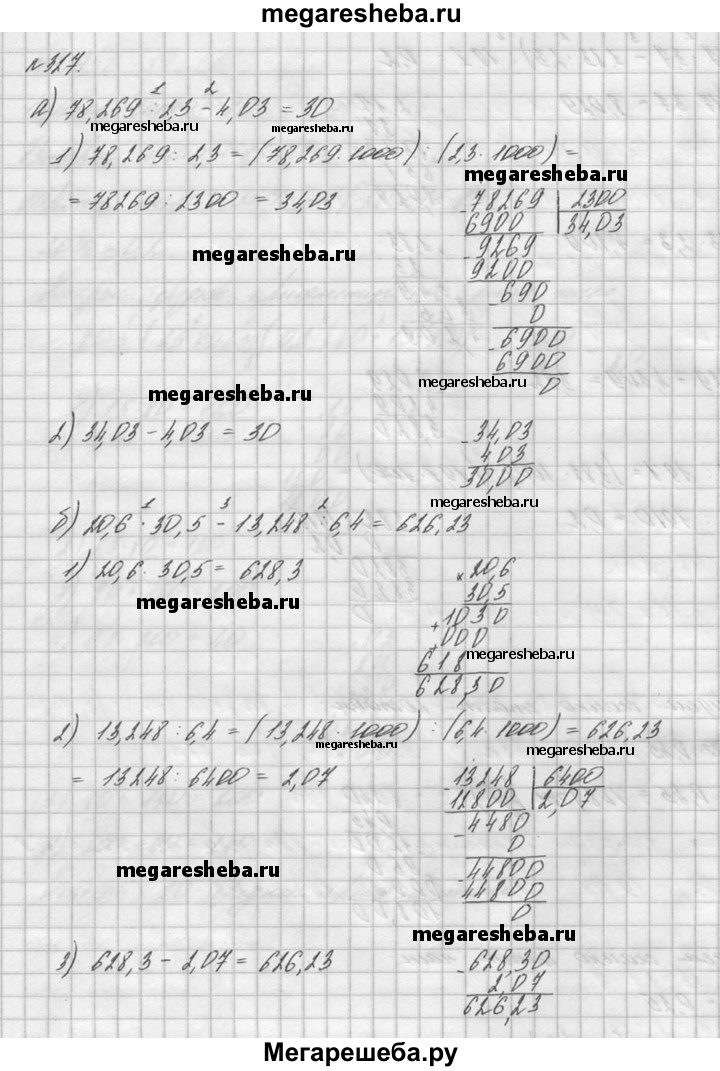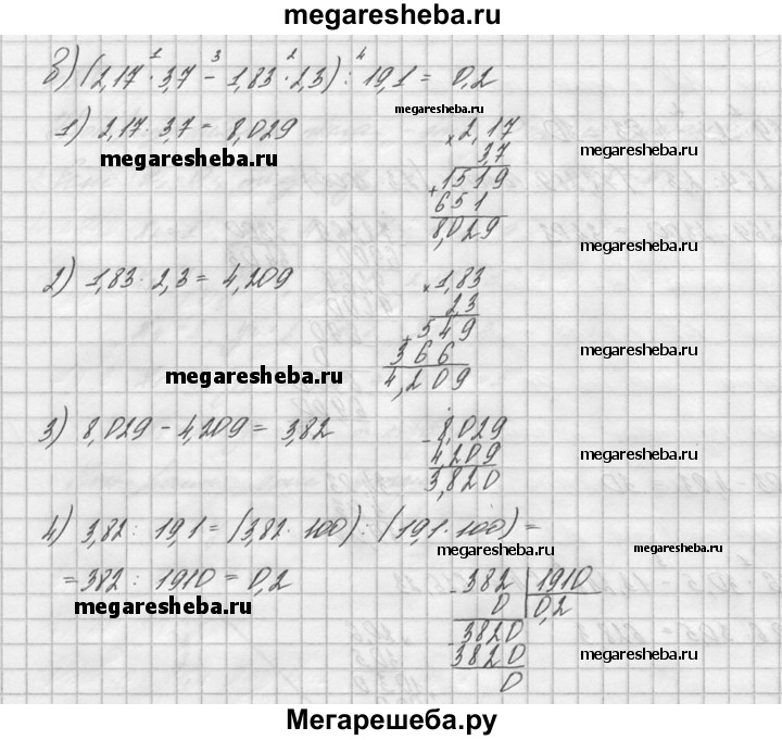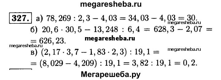 327. Выполните действия: а) 78,269 : 2,3 - 4,03; б) 20,6 * 30,5 - 13,248 : 6,4; в) (2,17-3,7 - 1,83-2,3): 19,1.