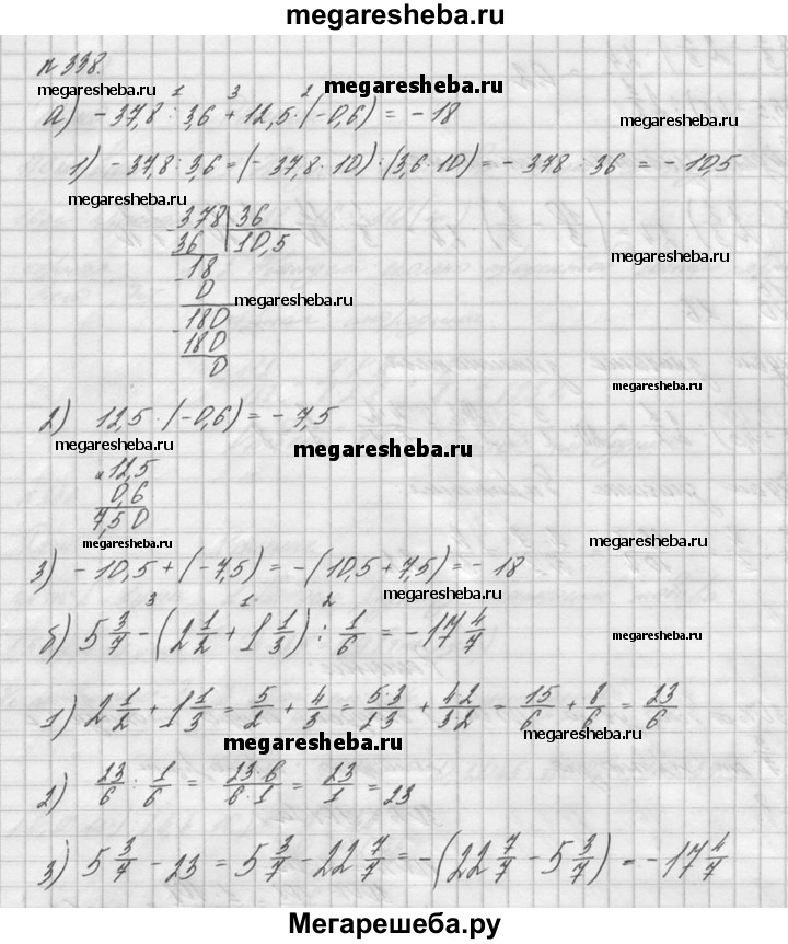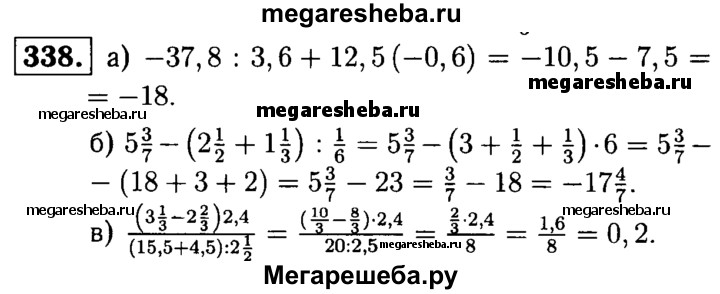 338. Найдите значение выражения: а) -37,8 : 3,6 + 12,5(-0,6); б) 5*3/7 - (2*1/1 + 1*1/3) ^ 1/6; в) (3*1/3 – 2*2/3)2.4 / (15,5 + 4,5): 2*1/2.
