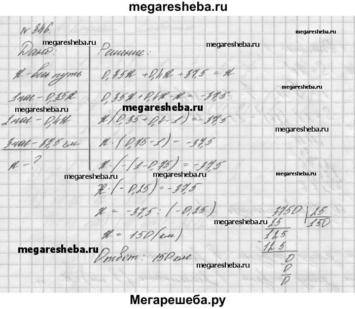 346. В первый час мотоциклист проехал 35% всего пути, во второй час — 0,4 пути, а в третий — остальные 37,5 км. Какое расстояние проехал мотоциклист за эти три часа?