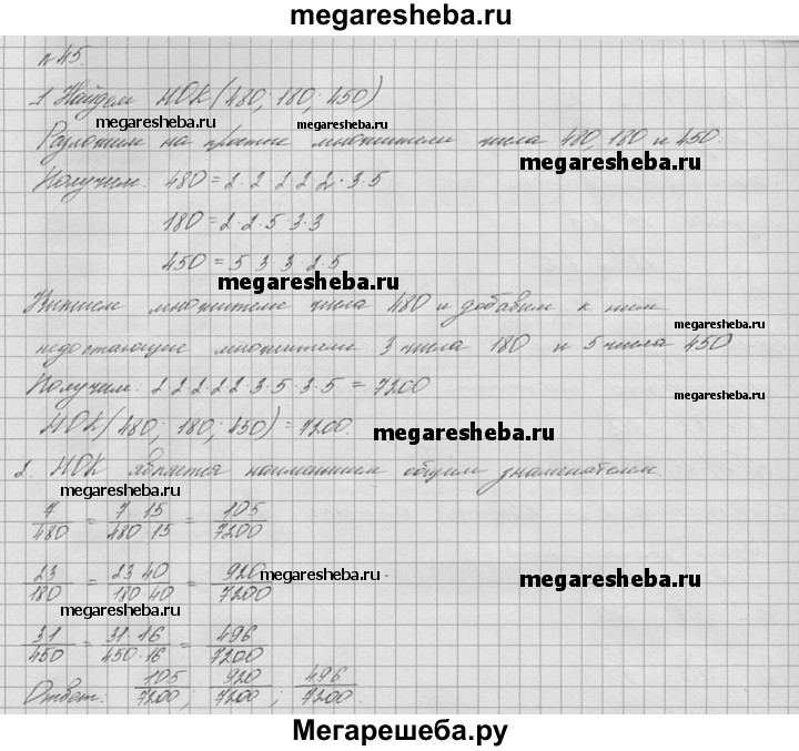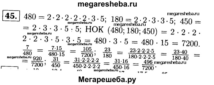 45. Найдите наименьшее общее кратное знаменателей дробей 7/480, 23/180, 31/450 с помощью разложения их на простые множители и приведите эти дроби к наименьшему общему знаменателю.
