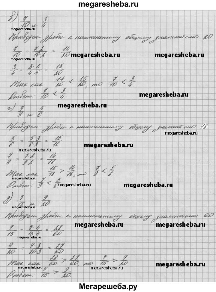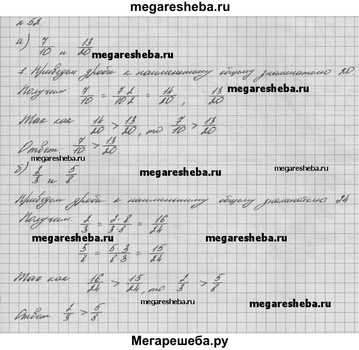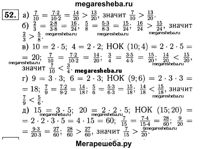 52. Сравните дроби: а) 7/10 и 13/20; б) 2/3 и 5/8; в) 7/10 и ¾; г) 7/9 и 5/6; д) 7/15 и 9/20.