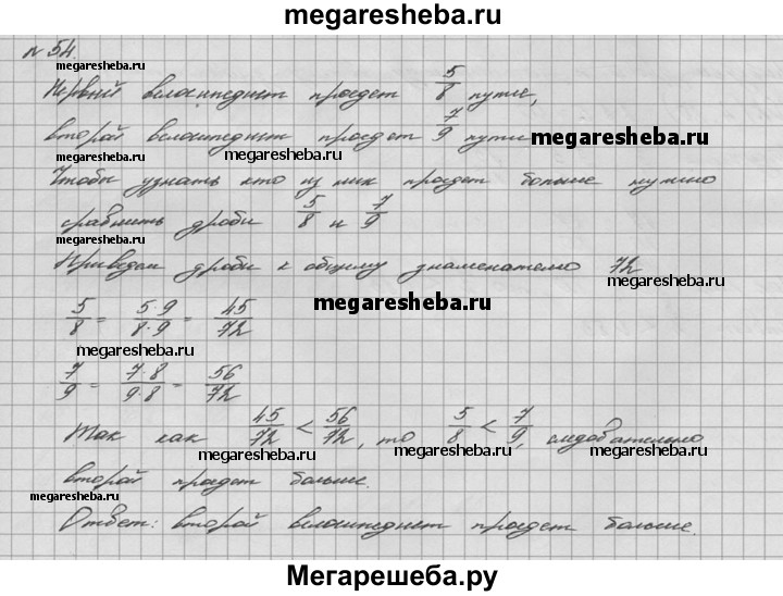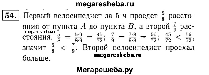 54. Расстояние от пункта А до пункта В первый велосипедист проезжает за 8 ч, а второй — за 9 ч. Кто из них проедет больше: первый за 5 ч или второй за 7 ч?