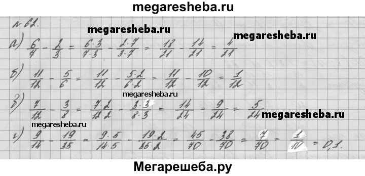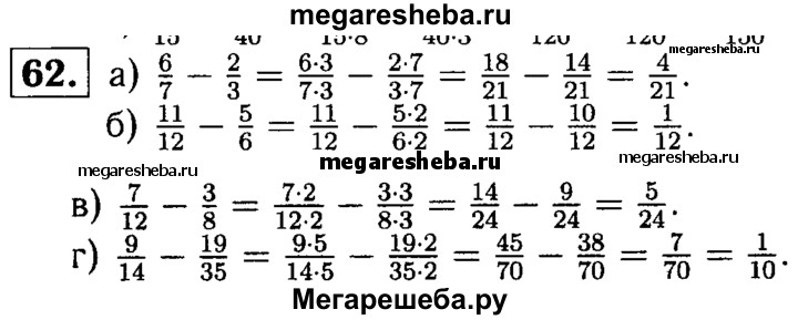 62. Выполните вычитание: а) 6/7 – 2/3; б) 11/12 – 5/6; в) 7/12 – 3/8; г) 9/14 – 19/35.