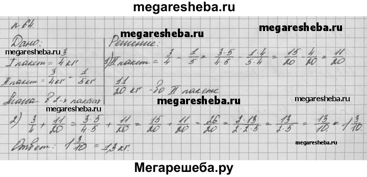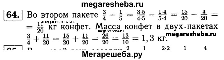 64. В одном пакете 3/4 кг конфет, а в другом — на 1/5 кг меньше. Какова масса конфет в двух пакетах вместе?