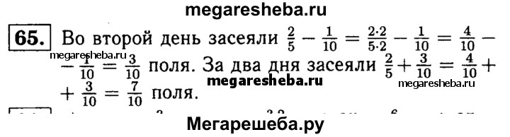 65. В первый день засеяли 2/5 поля, а во второй — на 1/10 поля меньше. Какую часть поля засеяли за эти два дня?