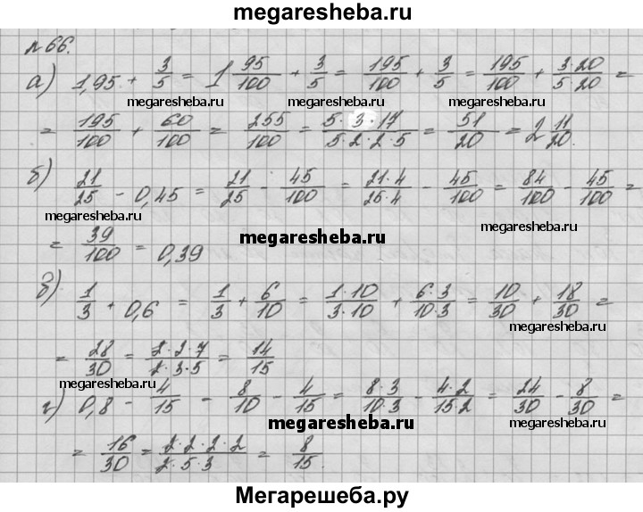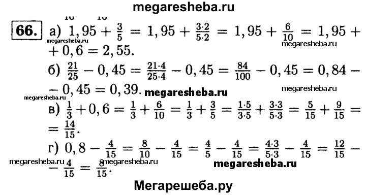 66. Выполните действие: а) 1,95 + 3/5; б) 21/25 - 0,45; в) 1/3 + 0,6; г) 0,8 – 4/15 .