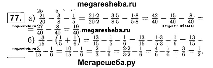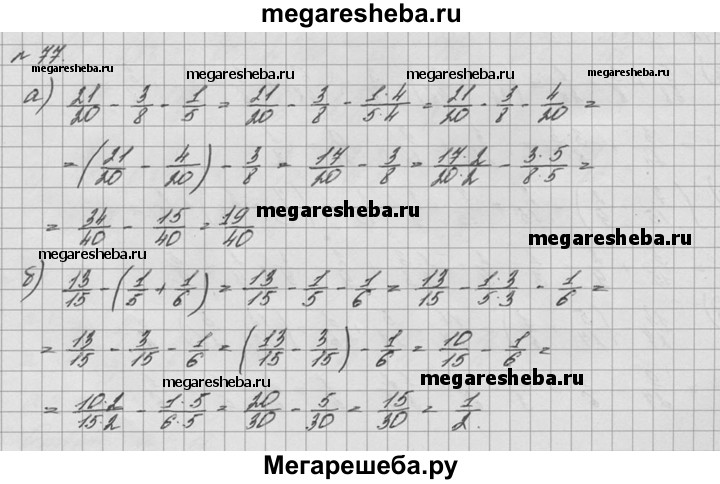 77. Найдите значение выражения: а) 21/20 – 3/8 – 1/5 б) 13/15 – (1/5 + 1/6).