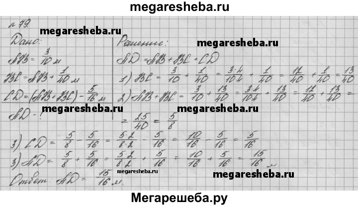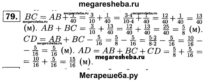 79. На отрезке AD отмечены точки В и С так, что точка С лежит между точками В и D. Известно, что АВ = 3/10 м, ВС больше АВ на 1/40 м, a CD меньше АВ + ВС на 5/16м. Найдите длину отрезка AD.