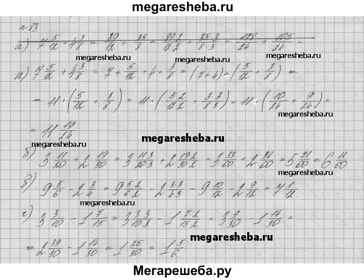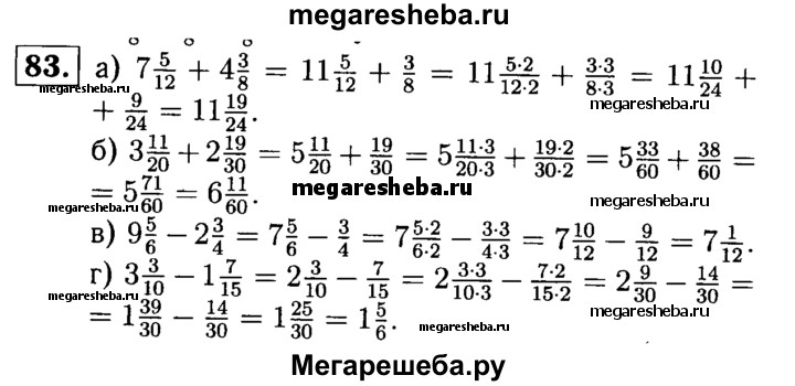 83. Выполните действие: а) 7*5/12 + 4*3/8; б) 3*11/20 + 2* 19/30; в) 9*5/6 – 2*3/4; г) 3*3/10– 1*7/15.