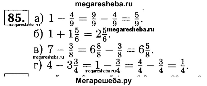 85. Найдите значение выражения: а) 1 - 4/9; б) 1 + 1*5/6; в) 7 - 3/8; г) 4 – 3*3/4.