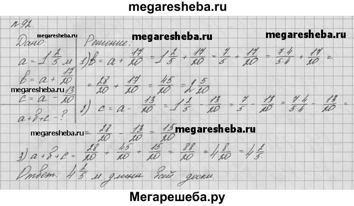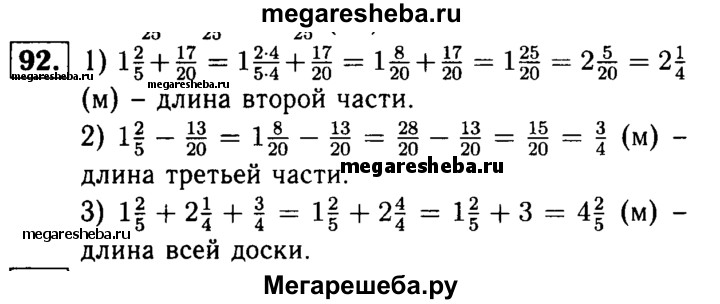92. Доску разрезали на три части. Длина первой части 1*2/5 м. Она короче второй части на 17/20 м и длиннее третьей части на 13/20 м. Найдите длину всей доски.