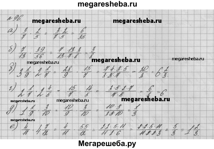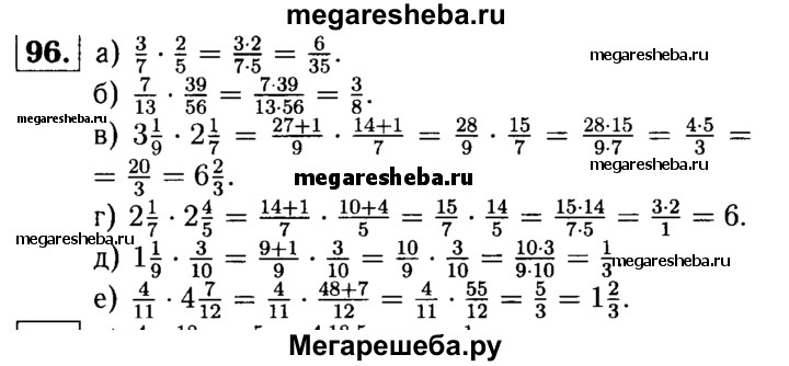 96. Выполните действие: а) 3/7 * 2/5; б) 7/13 * 39/56; в) 3*1/9 * 2*1/7; г) 2*1/7 * 2*4/5; д) 1*1/9 * 3/10; e) 4/11 * 4*7/12.