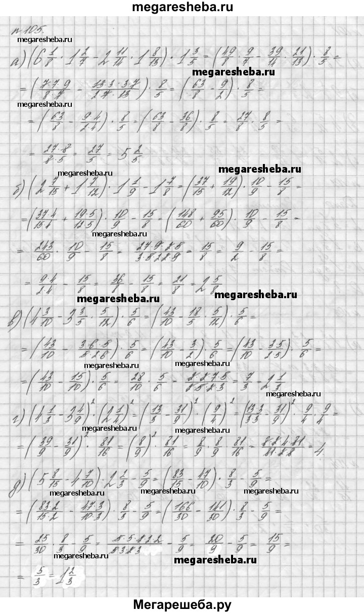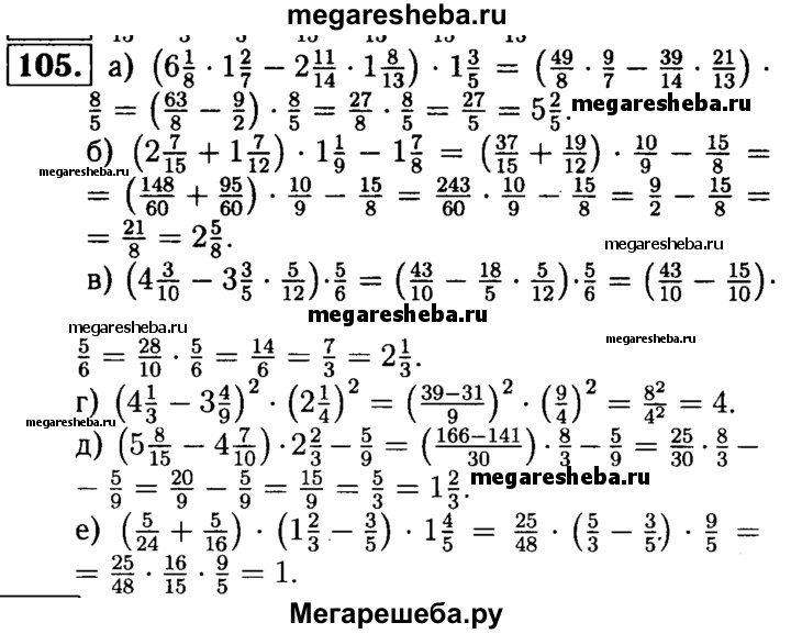 105. Найдите значение выражения: а) (6*1/8 * 1*2/7 – 2*11/14 * 1*8/13) *1*3/5; б) (2*7/15 + 1*7/12) * 1*1/9 – 1*7/8; в) (4*3/10 – 3*3/5 * 5/12) * 5/6; г) (4*1/3 – 3*4/9)2 * 1*4/5; д) (5*8/15 – 4*7/10) * 2*2/3 – 5/9; е) (5/24 + 5/16)*(1*2/3 – 3/5)* 1*4/5.