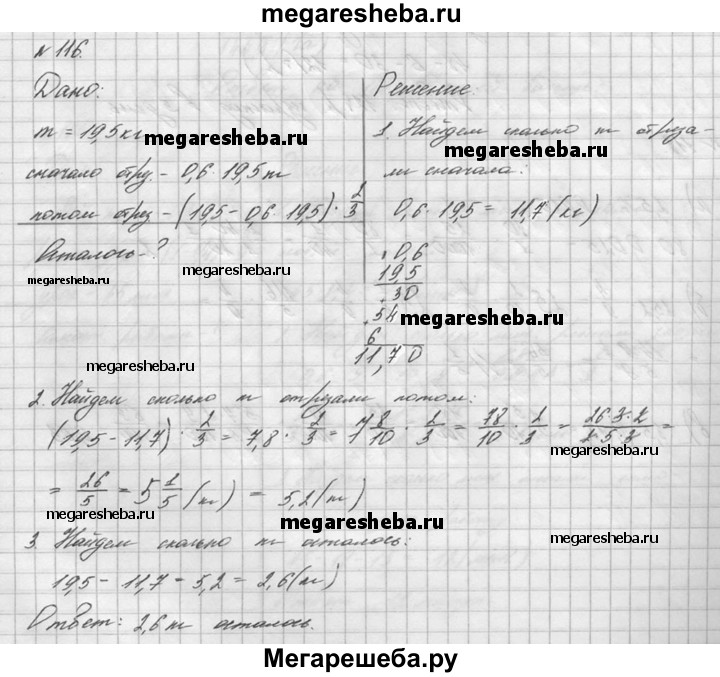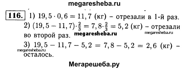 116. От куска металла массой 19,5 кг сначала отрезали 0,6 этого куска, а потом 2/3 остатка. Сколько килограммов металла осталось?
