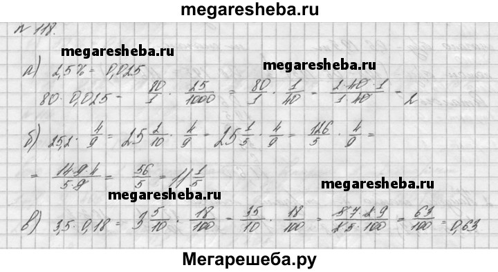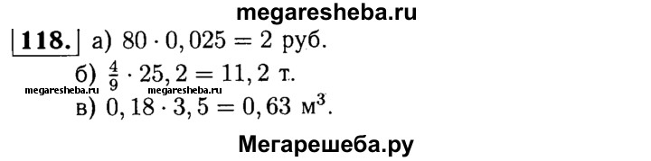 118. Найдите: а) 2,5% от 80 руб. ; б) 4/9 от 25,2 т ; в) 0,18 от 3,5 м3.