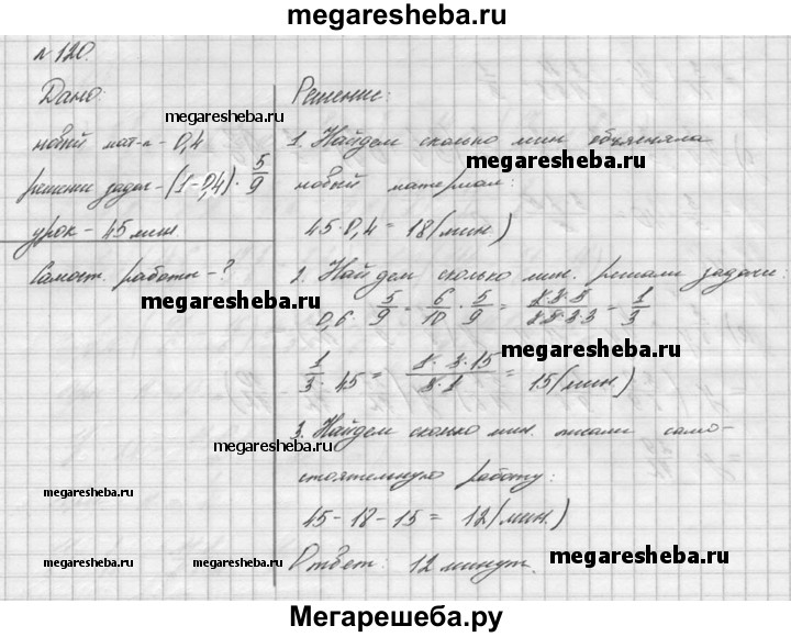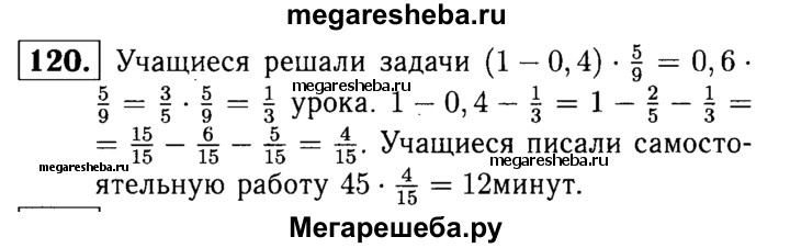 120. Учитель 0,4 урока объяснял новый материал, 5/9 остального времени урока ушло на решение задач, а в оставшееся время учащиеся писали самостоятельную работу. Сколько минут учащиеся писали работу, если урок длился 45 мин?
