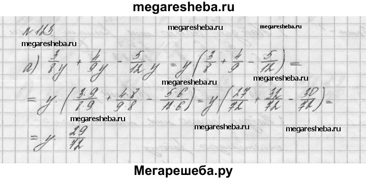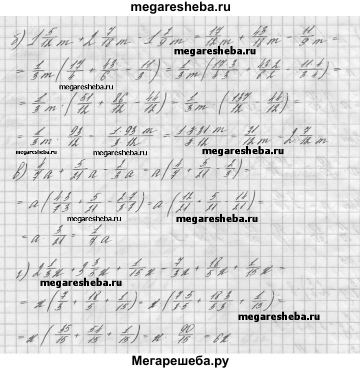 123. Упростите выражение: а) 3/8у + 4/9у – 5/12у; б) 1*5/12m + 2*7/18m – 1*2/9m; в) 4/7a + 5/21a – 2/3a; г) 2*1/3x + 3*3/5x + 1/15x.