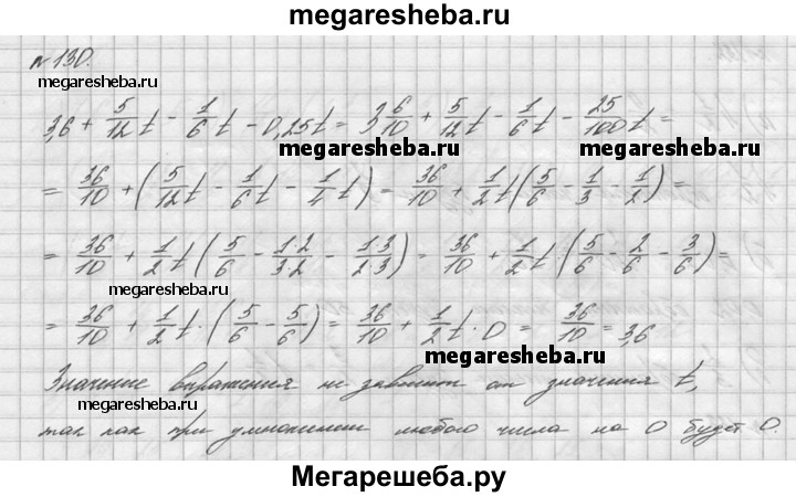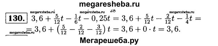 130. Докажите, что значение выражения 3,6 + 5/12t – 1/6t - 0,25t не зависит от значения t.