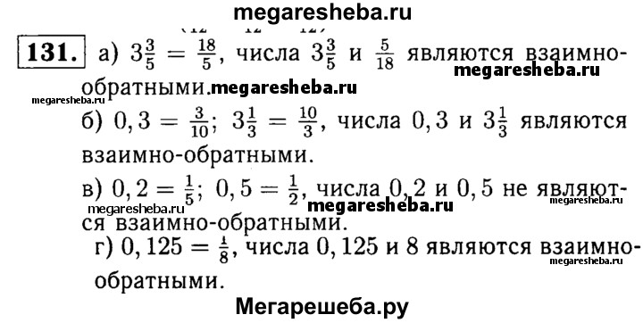 131. Будут ли взаимно-обратными числа: а) 3*3/5 и 5/18; б) 0,3 и 3*1/3; в) 0,2 и 0,5; г) 0,125 и 8?