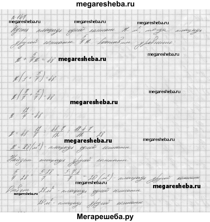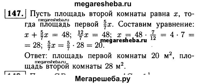 147. Площадь двух комнат 48 м2. Площадь одной комнаты составляет 5/7 от площади другой. Найдите площадь каждой комнаты.