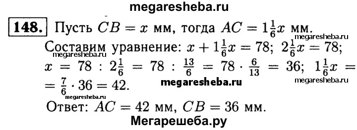 148. Точка С разделила отрезок АВ на два отрезка АС и СВ так, что отрезок АС оказался длиннее отрезка СВ в 1*1/6 раза. Найдите длину отрезков АС и СВ, если АВ = 78 мм.