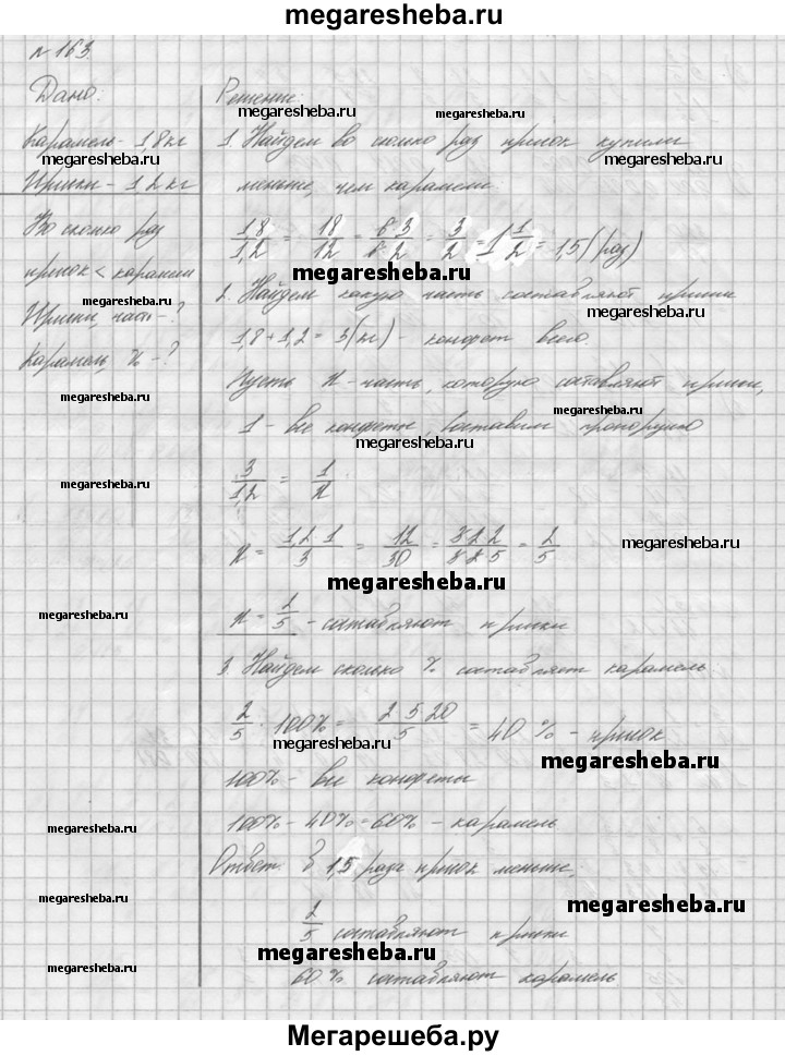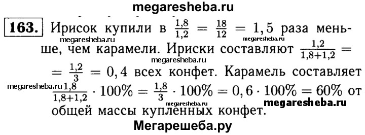 163. Купили 1,8 кг карамели и 1,2 кг ирисок. Во сколько раз меньше купили ирисок, чем карамели? Какую часть купленных конфет составляют ириски? Сколько процентов составляют карамель от общей массы купленных конфет?