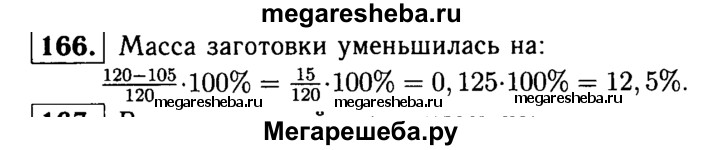 166. При обработке заготовки ее масса уменьшилась со 120 кг до 105 кг. На сколько процентов уменьшилась масса заготовки?