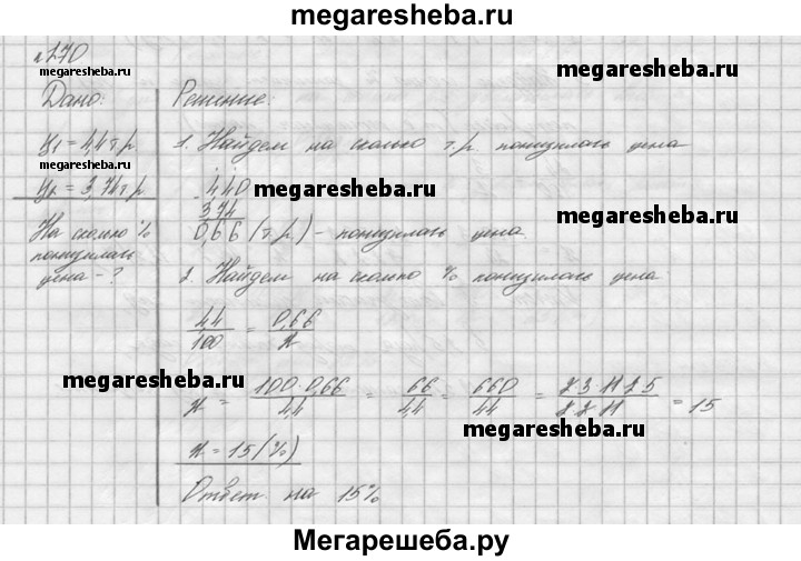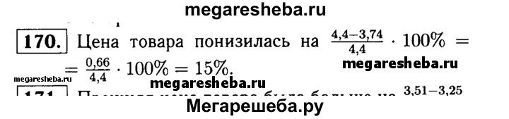 170. Цена товара понизилась с 4,4 тыс. рублей до 3,74 тыс. рублей. На сколько процентов понизилась цена товара?