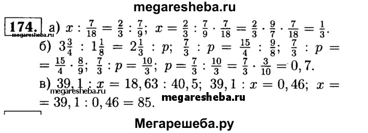 174. Решите уравнение: а) х : 7/18 = 2/3 : 7/9 ; б) 3*3/4 : 1*1/8 = 2*1/3 : р; в) 39,1: х = 18,63 : 40,5.