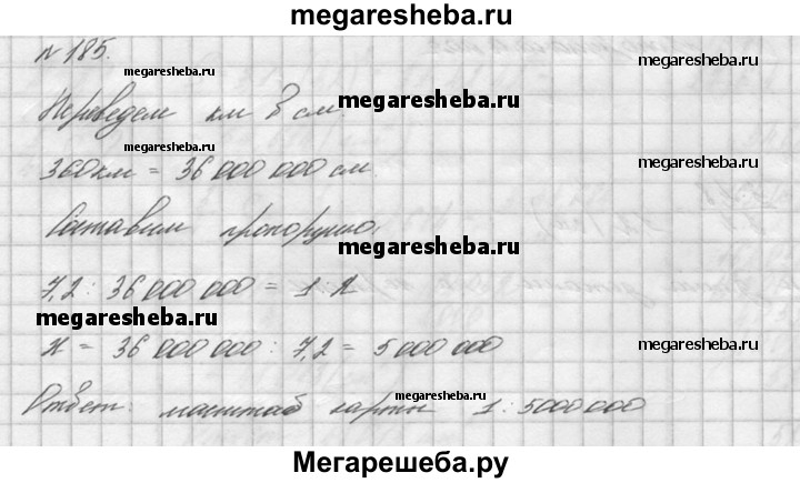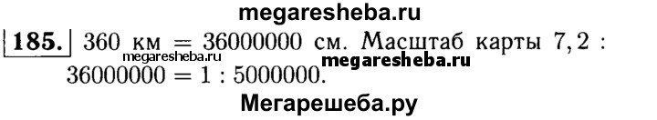 185. Расстояние между пунктами А и В на карте равно 7,2 см, а на местности 360 км. Найдите масштаб карты.
