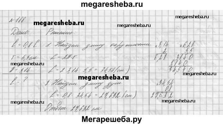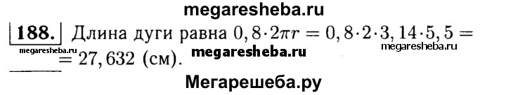 188. Найдите длину дуги, равную 0,8 длины окружности, радиус которой 5,5 см. (Число π округлите до сотых.)